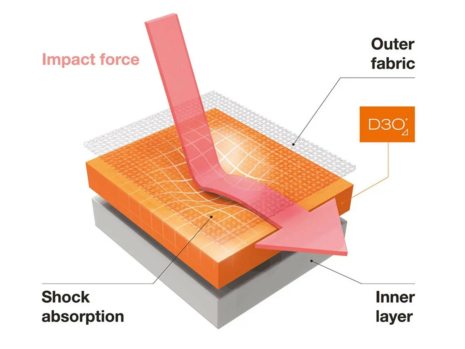 À l’état naturel et en cas de léger mouvement, les particules des matériaux D3O® sont mobiles. Sous l’effet d’une force, elles s’assemblent en une structure solide pour absorber et disperser l’énergie de l’impact avant de se séparer et de redevenir mobiles. Plus l’énergie de l’impact est importante, plus les particules se lient solidement, offrant ainsi une protection encore plus grande.